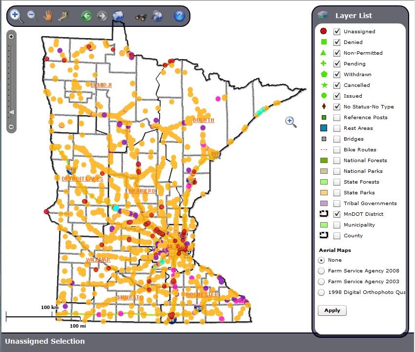 For additional access to the outdoor advertising data, Great Arc developed a custom web-based mapping application for viewing OAPRT data. Mn/DOT staff can navigate and search state-wide OAPRT data using through a user-friendly web browser-based application. The web application provides tools for navigation, viewing, and attribute searching for permit and unassigned records. Authorized users may log in to assign permit records to unassigned signs.