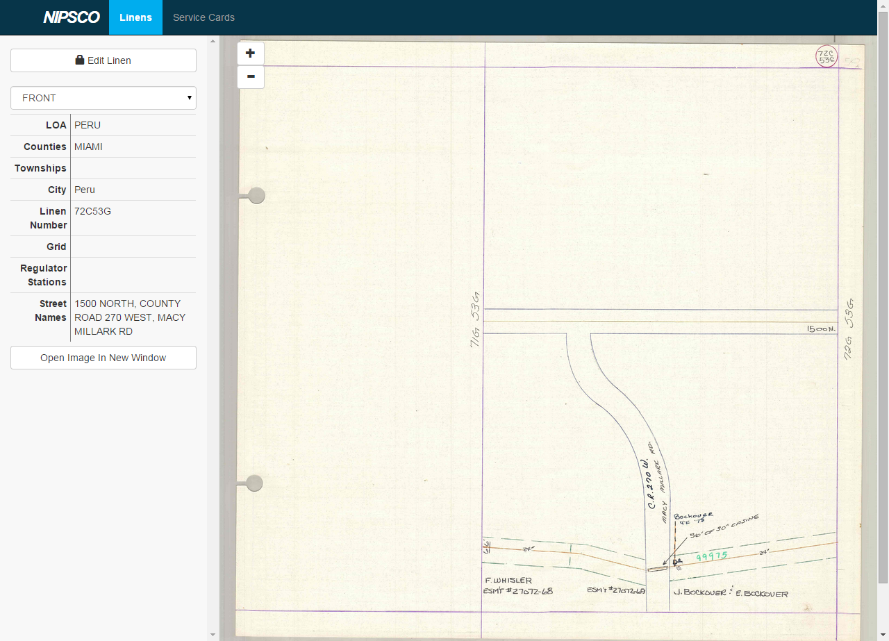NIPSCO had documents dating back several decades that were drawn and maintained on linen sheets. These sheets contained various scale map drawing showing streets and property locations along with gas and electric facility locations. In addition, NIPSCO had index size cards also many decades old showing service facility locations and tabular data for individual properties. Scanned images were created for each of this, and an index database created. NIPSCO now wanted to allow the searching and viewing of these images in a web-based format.