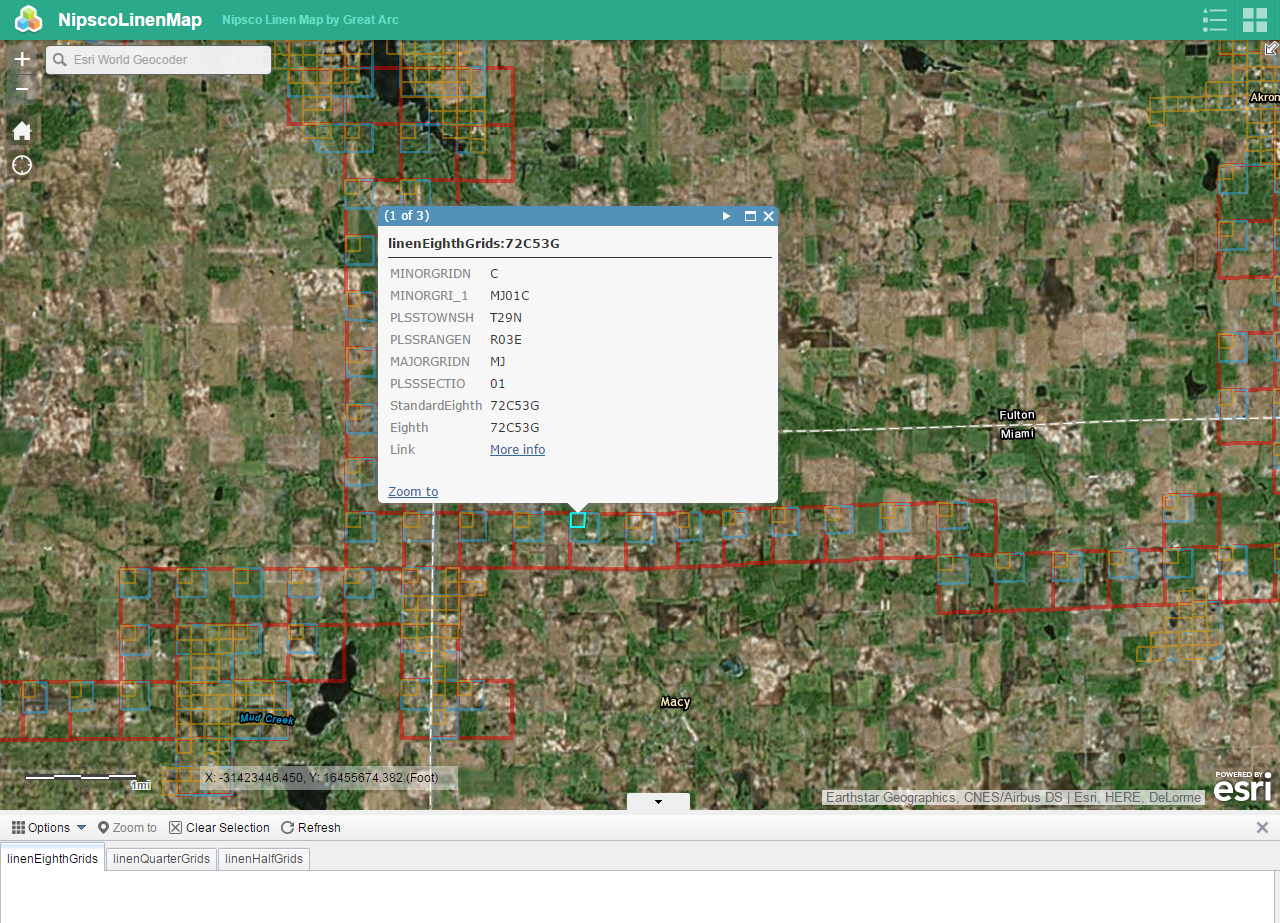 Great Arc built several applications, both desktop and web, to view and search on the images. In order to access the data within ArcGIS, Great Arc created a polygon feature class to hyperlink to the image data. To allow NIPSCO to view and QC this data, we built a web-based application that utilized the ESRI WebApp Builder templates, specifically the ESRI Geocoder, Attribute Table, Legend and Basemap Gallery widgets. This allows users to select one or more of the polygon features, view the tabular information, and by selecting the hyperlink field, launching another web application that we built that allows for a detailed view of the images and data.