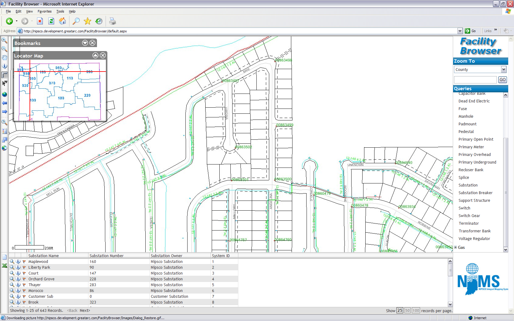 Great Arc’s solution, Facility Browser, incorporates the XML-driven design as well as the required domains and subtypes into a cohesive web application that allows users to navigate, query, and report on all of the NIPSCO enterprise data. Facility Browser was built using Great Arc’s MapXtender product, which provides authoring tools for creating feature-rich web and desktop applications.