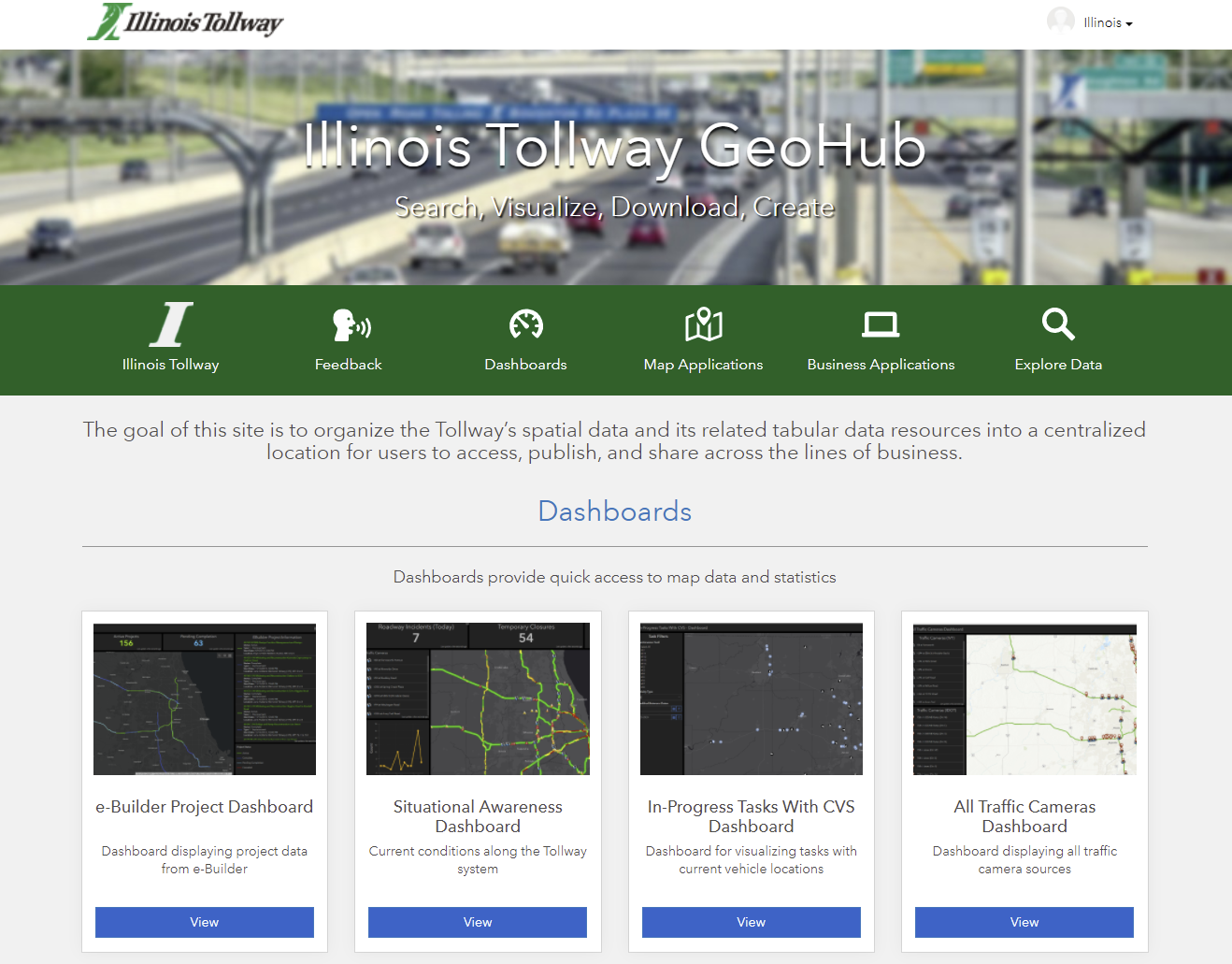 The Tollway GeoHub is a new web-based system that provides a one-stop shop to geospatial information managed by the Tollway and its partnering contractors. It brings together disparate data from many sources (spatial data stored in Cartegraph, EBuilder project information, ArcGIS Online, and in-house GIS data) into a single location, along with maps, dashboards, and tailored applications for a wide variety of users.